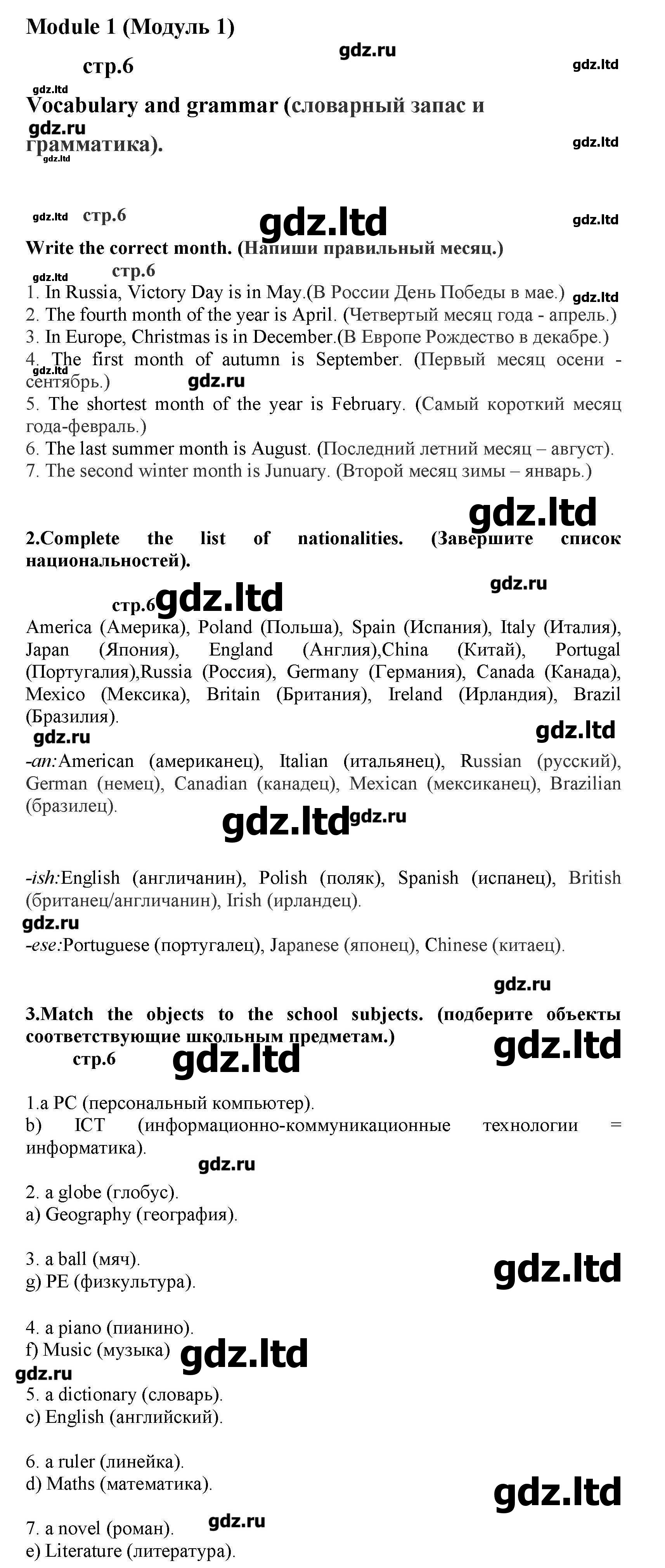 Сборник имеет восемьдесят девять страниц, на которых упражнения распределены по шести модулям. Так же в конце издания представлены тестовые работы, которые помогут понять насколько именно усвоен материал. ГДЗ по английскому языку 5 класс Комиссаров включает в себя полноценный перевод и доскональные ответы по всем номерам.